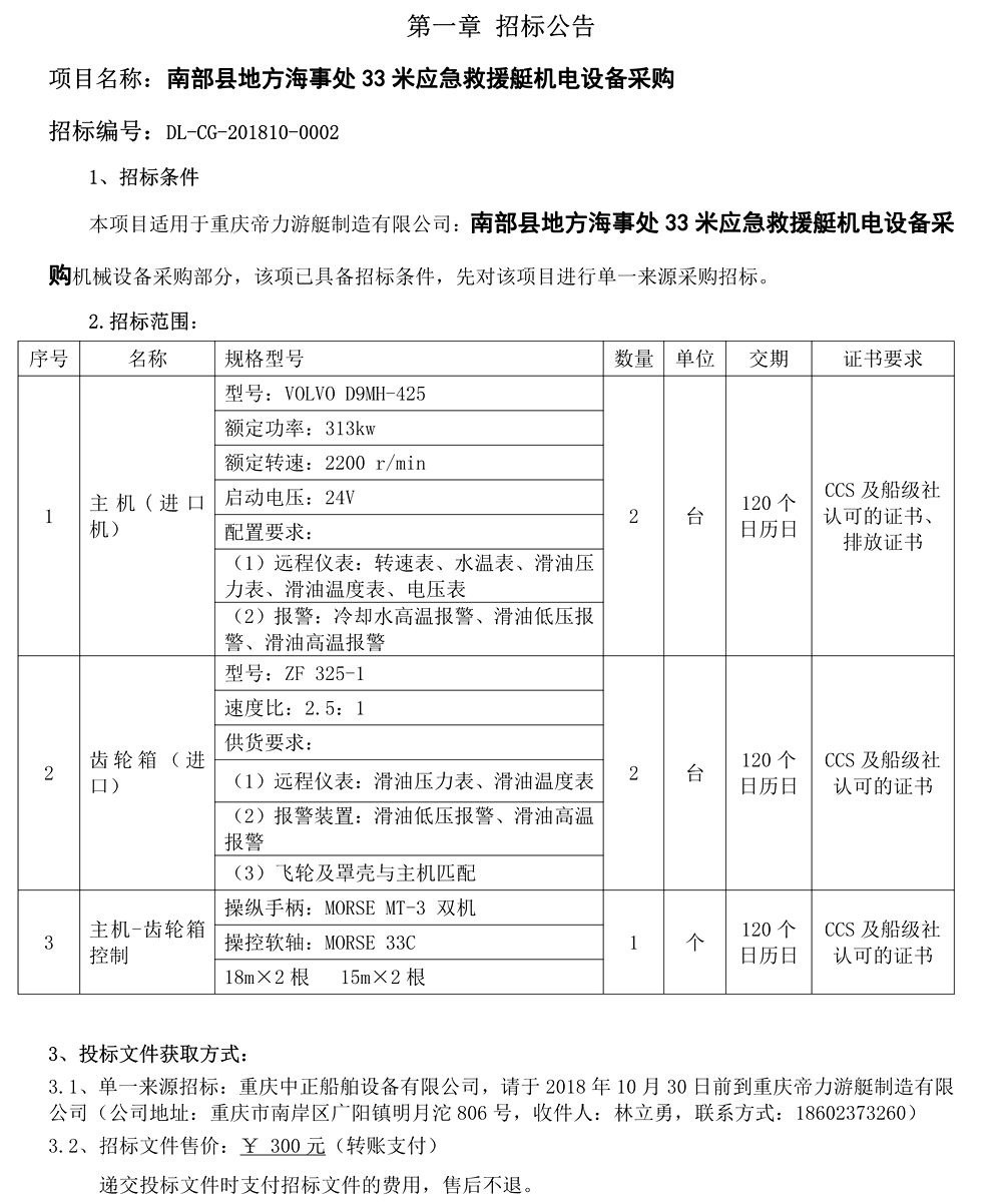 蓬安縣地方海事處33米應急救援艇機電設備采購